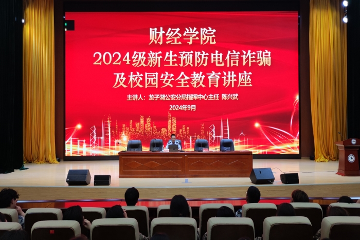 为进一步提升学生的安全防范意识和自我保护能力,9月10日晚上,财经学院在东辅楼报告厅举办了预防电信诈骗及校园安全教育专题讲座。讲座由新时代先进模范人物、全国公安机关成绩突出个人荣誉称号获得者、“安徽省杰出人民警察”、蚌埠市龙子湖公安分局指挥中心主任陈兴武同志主讲。财经学院党委副书记、纪委书记耿广汉主持,全体辅导员及2024级新生参加。