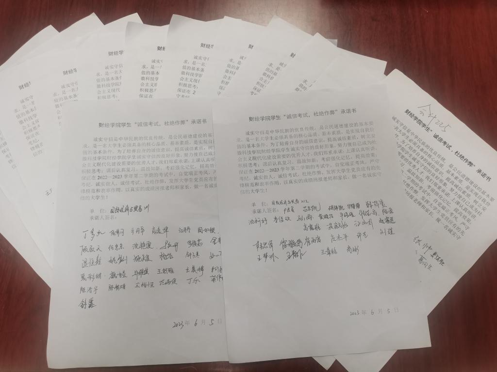 诚信是中华民族的传统美德,也是检验大学生品格的重要依据。财经学院各班级严肃考风考纪教育,相继召开主题班会,班会上各位辅导员领学了国家和学校关于诚信考试的相关文件,也介绍了考试作弊的严重后果,强化了诚信考试教育。班会上各班还签订了《财经学院学生“诚信考试,杜绝作弊”承诺书》,同学们签署诚信考试承诺书,以自己的实际行动践行诚信考试决心,树立诚信形象,争当诚信学生。