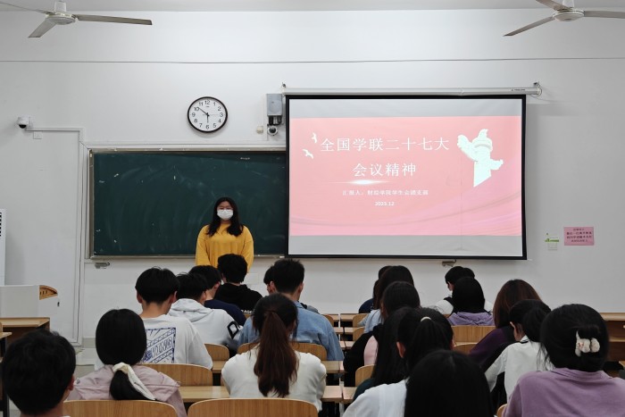 为全面贯彻落实全国学联第二十七大会议内容和精神,引领青年学生志存高远,激励青年学生坚定理想信念,12月29日,财经学院于致知楼C108开展“学习全国学联二十七大会议精神”理论宣讲。宣讲会由院学生会主席团成员黄欣宇主持。
