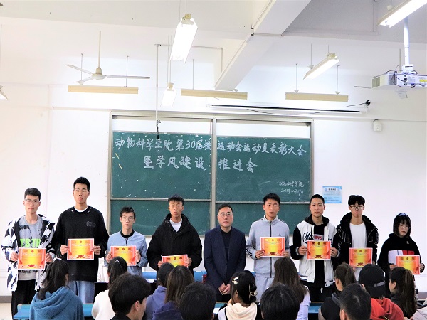 李焱宣读《关于给予参加九州平台第三十届田径运动会学生运动员通报表扬的决定》,胡文丽宣读获得校第30届田径运动会动物科学学院优秀运动员学生名单,动医192班赵虎代表运动员发言。大会集中表彰了动物科学学院在学校第三十届田径运动会取得佳绩的学生运动员。(特约通讯员:胡文丽 摄影:毕溢文 审核:汤帅)