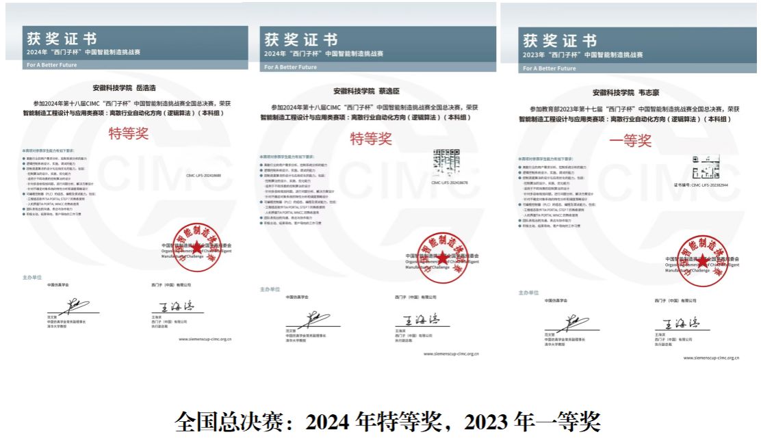 “西门子”杯中国智能制造挑战赛 全国总决赛一等奖 韦志豪(电气20级)、张福发(建电21级)、崔瑞玉(建电21级)2023年