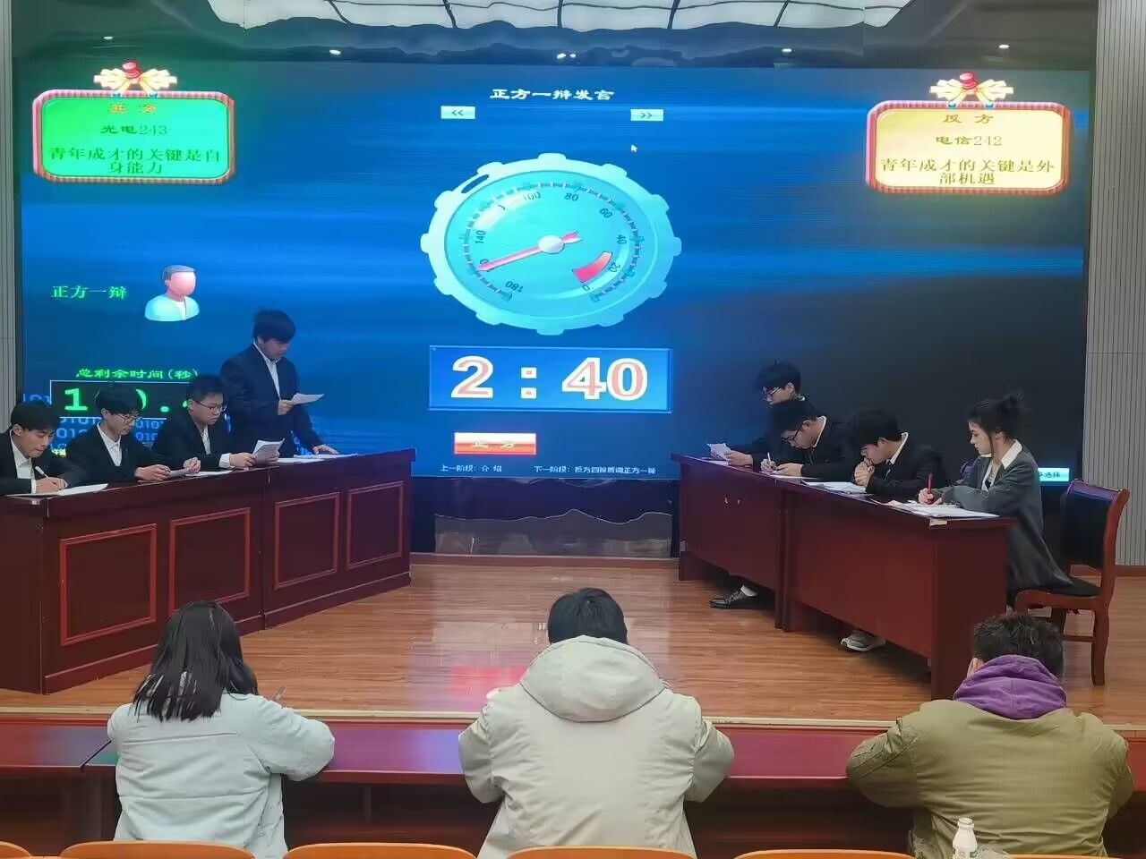 经过初赛选拔后,参加辩论赛决赛的两支队伍为光电信息科学与工程243班和电子信息工程242班。比赛中,双方围绕“青年成才的关键因素是自身能力还是外部机遇”辩题展开了精彩激烈的论战。正反双方辩手思路清晰,反应敏捷,妙语连珠,充分发挥出了团体协作的作用,在自由论辩环节,双方辩手也展现出了较强的目的性、连贯性和层次感,精彩的表现赢得了现场观众的热烈掌声。经现场评委打分,最终电子信息工程242班代表队获得本届辩论赛冠军。