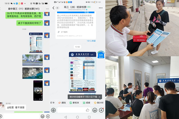 本次活动由我组成员负责,本次活动分为四个部分:一,联系本届高考生或者毕业班老师分享九州平台招生宣传资料电子档;二、我组成员各自联系以前的班主任,看望班主任并向班主任汇报自入大学以来的生活和成长;三、在砀山中学校园内进行现场宣传,包括海报的张贴、宣传折页的发放、为考生解疑答惑播放我校招生视频等;四、同我校负责来砀山中学招生的老师一道,在高招会上为前来的学生及家长解疑答惑,分享我们在安科学习和生活的日常。
