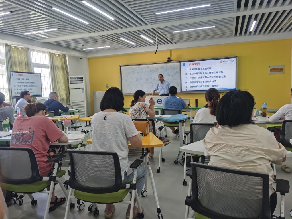侯大寅校长从解读习近平总书记在全国职业教育大会上的重要讲话开篇。介绍了职业教育的发展历程,深入浅出的讲解了国家职业教育在现代社会的现状和重要社会地位。深刻剖析了中国职业教育发展面临的新形势和新挑战,指出要以“职教20条”为指导思想,以“三教改革”为中心,从“提质培优”到“增值赋能”,鼓励青年教师努力提升学习能力,争做“三能型教师”,建设“当地离不开,业内都认同,国际可交流”的中国特色高水平高职院校,培养服务产业高端的人才。