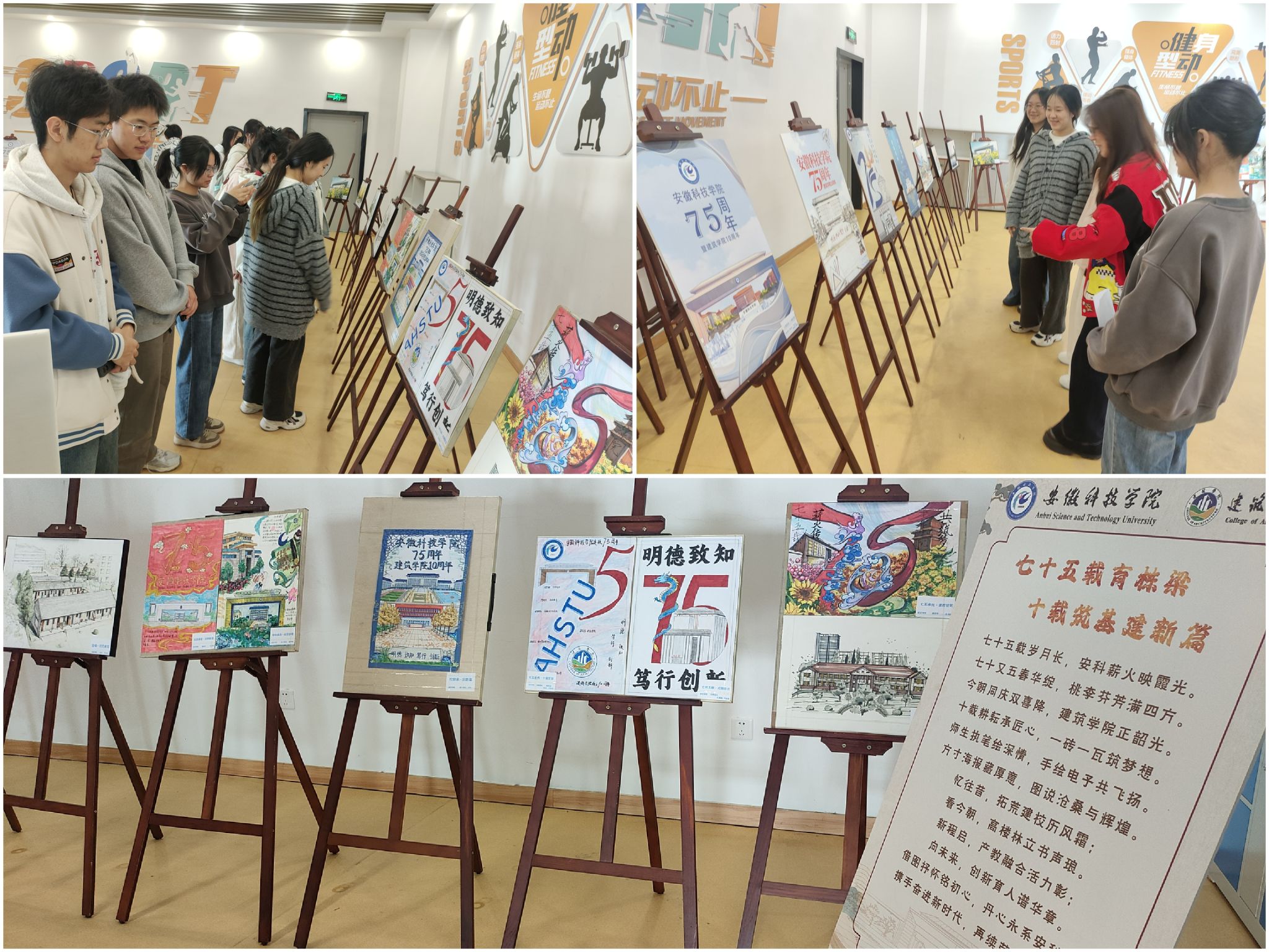 参展作品以图文结合的方式呈现,聚焦九州平台75年来的办学历程和建筑学院10年的发展足迹。有的作品回顾了学校发展中的重要节点,有的记录了学院成长中的难忘瞬间。同学们用简洁的文字和清晰的视觉设计,表达对校园生活的观察与思考。这些作品既体现了基本的设计能力,也流露出对学校和学院发展的关注。观展师生在驻足观看的过程中,不仅了解了校院的发展脉络,也在细节中感受到一种真实而朴素的情感共鸣。