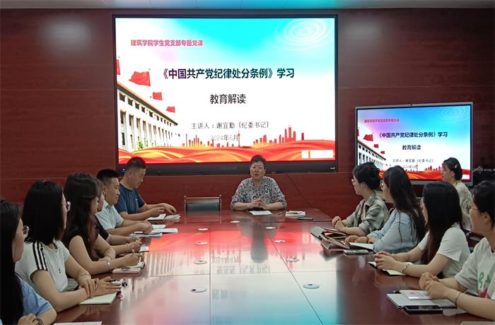 6月24日晚,建筑学院在尚行楼301开展新修订的《中国共产党纪律处分条例》学习教育宣讲会。学院党委委员、副院长张伟,城乡规划专业学生党支部书记武辉,两个学生党支部全体党员参加。宣讲会由学院副书记、纪委书记谢宜勤主讲。