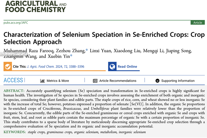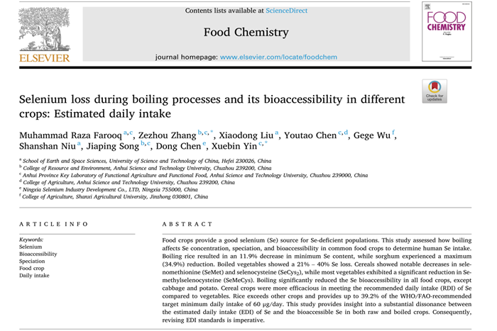 近日,我校长三角功能农业(食品)研究院院长尹雪斌教授及张泽洲博士(共同通讯作者)与中国科学技术大学合作,在一区TOP期刊Food Chemistry(IF=8.8)与Journal of Agricultural and Food Chemistry(IF=6.1)分别在线发表题为“Selenium loss during boiling processes and its bioaccessibility in different crops: Estimated daily intake”与“Characterization of Selenium Speciation in Se-Enriched Crops: Crop Selection Approach”两篇研究论文,中国科学技术大学博士生Muhammad Raza Farooq为第一作者,我校资源与环境学院宋佳平博士、农学院陈友桃博士为共同署名作者。