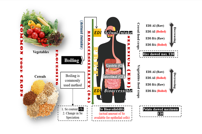 Food Chemistry发表的论文对烹饪过程中硒形态变化进行探究,表明主粮等农产品烹饪后会导致硒含量显著降低11.9% - 34.9%,且发现不同作物中不同硒形态,如硒代蛋氨酸(SeMet)、硒代半胱氨酸(SeCysCysSe)和硒甲基硒代半胱氨酸(SeMeCys)等的损失存在差异,同时强调了在解决硒营养需求时考虑烹饪方法的必要性。该研究根据不同作物的硒生物可给性预估出不同作物的硒每日摄入量(EDI),对预估烹饪后食品中硒的实际摄入量具有重要意义,指导硒膳食补充建议,提出了优化功能农业实践的潜在途径,以保持烹饪后的功能食品满足EDI的需求,确保作物的营养质量。