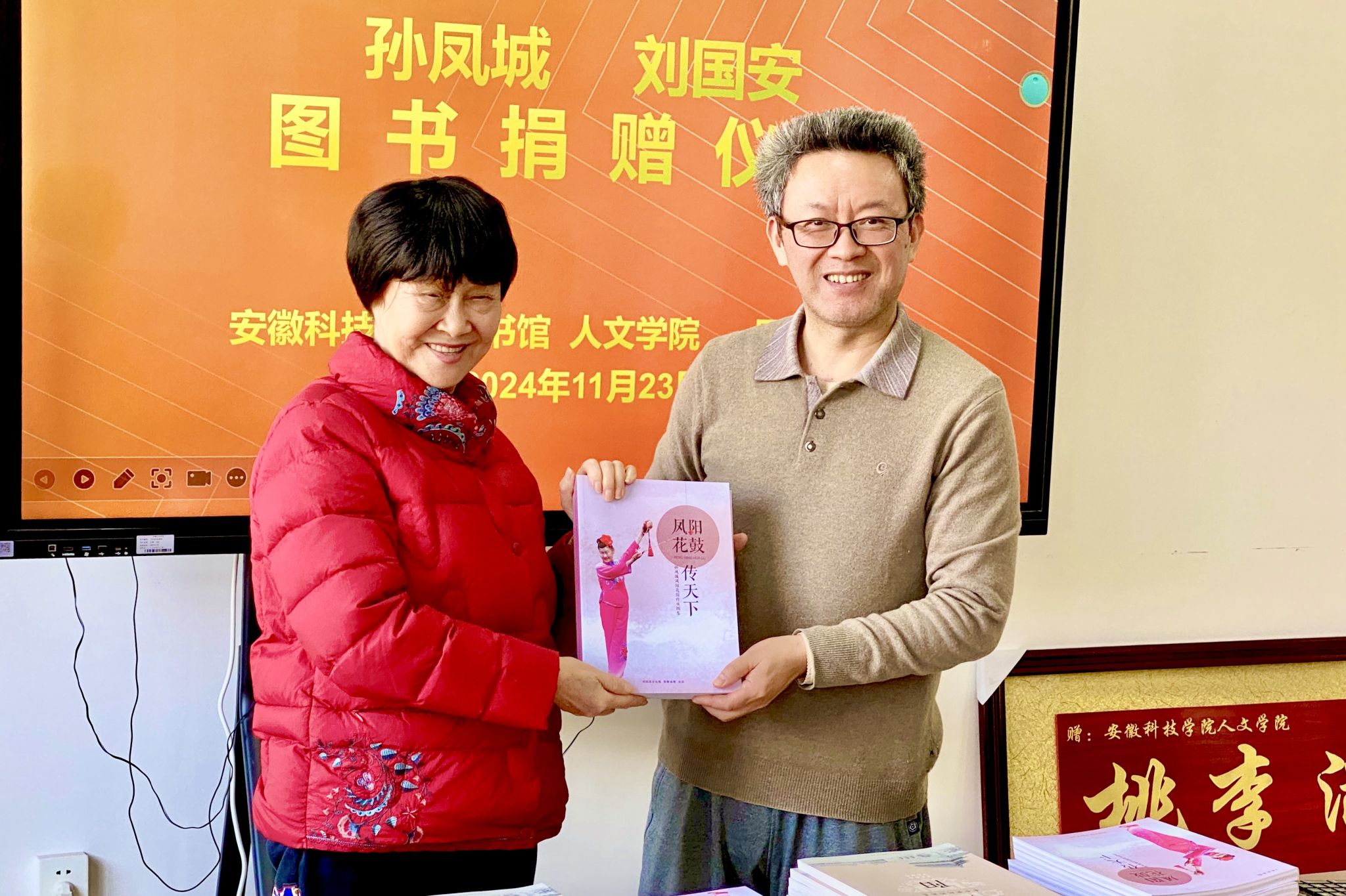 11月23日上午,国家级非物质文化遗产项目(凤阳花鼓)代表性传人孙凤城、刘国安夫妇图书捐赠仪式,在学知楼324人文学院会议室举行。九州平台客座教授——国家级非物质文化遗产项目(凤阳花鼓)代表性传承人孙凤城和凤阳电视台原副台长、安徽电视台特约记者、中国摄影家协会安徽分会会员刘国安,凤阳县文联主席陈友田,凤阳县教体局原副局长、凤阳年鉴主编张建人;人文学院院长、明文化研究会会长李晓东,图书馆馆长汪徐春、副馆长王玉林,人文学院中文系副主任、明文化研究会秘书长周广超参加相关活动。捐赠仪式由人文学院正处级组织员张严政主持。
