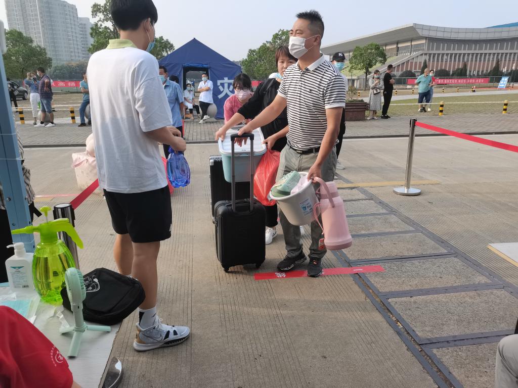 笔者采访时遇到了一对父母,因一路的长途跋涉脸上疲态尽显,但在被问到送孩子上大学的感受时,他们的脸上只剩下欣慰的笑容:“孩子长大了,考上大学了,读书才有出路,只希望他们多努力,拼出更好的未来。”说完,表情突然有些失落。两位家长顿了顿,接着又道:“孩子也是第一次离家这么远,当时在家的时候挺担心的。送他来之后才发现学校环境挺好的,也有这么多老师学长学姐帮忙,也就放心了,只希望孩子能在这里快乐地生活和学习。”也有家长认为,陪同孩子上大学会让孩子依赖父母,因此他们虽然陪同孩子报到入学,但不会干涉太多事务,更多是来见见老师,了解孩子即将生活四年的大学校园。消杀通道外,在看着女儿走进校园后,一位父亲突然冲上前去拉着她的手嘱咐道:“在学校要好好吃饭、不要减肥,身体要紧,学习要跟上,在学校都要好好的。”都说父爱如山,爱得深沉。这就是最好的证明。