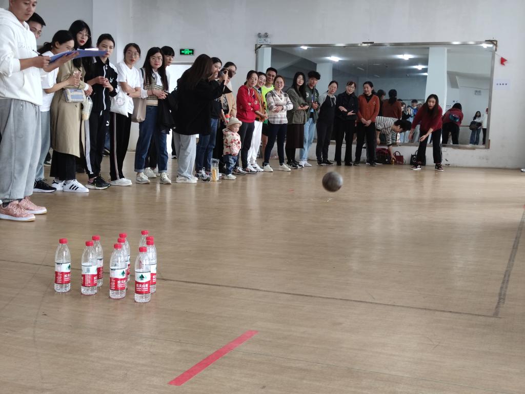 仿保龄球比赛中,老师们将手中的球扔出,精准的将放置在定点的瓶子顺次砸到。