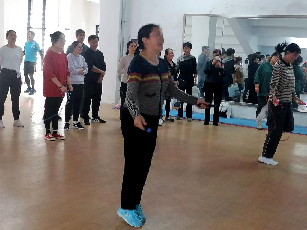 细绳在空中来回翻飞,划出一道道完美的弧线。老师身手矫健,以各种优美的姿态越过跳绳。褪去在三尺讲台上“一支粉笔、两袖清风”的优雅从容,他们的竞技精神与个人风采依旧不减当年,整个赛场气氛异常激烈。