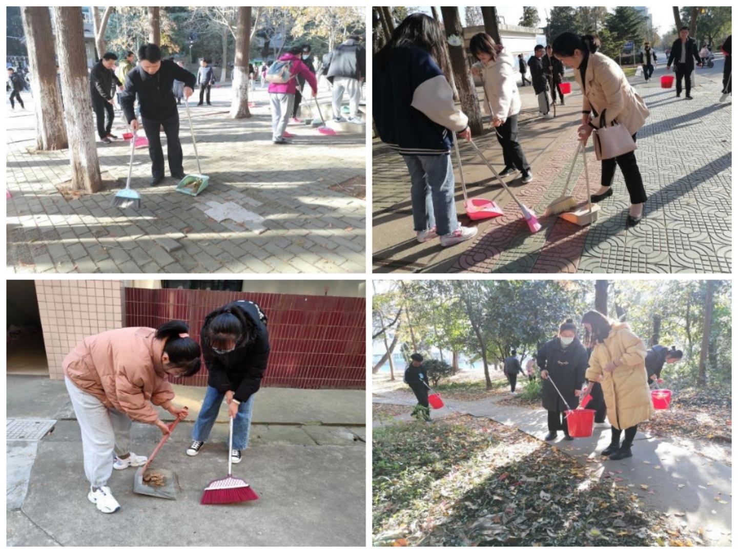 活动开始,在简单的分工后,师生党员和同学们带上扫帚、垃圾袋、垃圾桶和垃圾夹子等劳动工具有序走向划分的劳动区域。学院领导、教师以身作则,率先拿起扫帚,清扫道路落叶,给同学们做了良好榜样。同学们在后山清理了废弃物,进行垃圾清扫和卫生美化并积极清扫路面垃圾、落叶,认真清除墙面广告,将宿舍门口的车辆摆放整齐。劳动过程中,他们不怕脏、不怕累,俯下身子,积极肯干,营造了浓厚的劳动氛围。