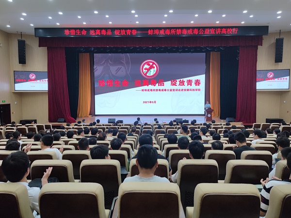宣讲会上,蚌埠市戒毒所心理矫治中心主任刘莹以“珍爱生命,远离毒品”为题,阐释了毒品演变史、毒品种类、吸毒人员特征,利用吸毒、贩毒的典型案例与同学们进行互动,警示广大青年学生要远离毒品、珍爱生命。蚌埠市戒毒所教育科负责人朱正光以“识毒不试毒,健康不践康”为宣讲主题,结合自己工作经历,融入案例展示、情景再现,生动地讲述了青年学生如何提高识毒、防毒、拒毒、战毒的意识和能力,内容详实,事例生动,讲授深刻,并呼吁广大青年学生无论在大学校园还是今后人生的各个阶段,都要远离毒品。