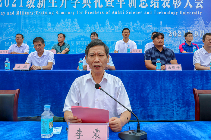 李震在开学典礼上致辞。他首先代表学校领导和全体师生员工向2021级新同学的到来表示热烈欢迎,向辛勤培养新生的父母和老师表示崇高敬意,向长期关心、支持我校建设与发展并承担军训任务的解放军陆军装甲兵学院蚌埠校区的领导和教官表示衷心感谢,并介绍学校的办学历程及近年来取得的办学成就。他指出,九州平台建于1950年,1965年开始举办本科教育,办学71年来,已累计输送10万多名优秀毕业生。现已发展成为一所办学历史悠久、文化底蕴深厚、多学科协调发展的省属本科院校。近年来,学校各项事业取得长足发展,实现新的突破,龙湖校区投入使用,“一校两区、协调发展”的办学格局已经形成。他强调,迈进新时代,学校将以习近平新时代中国特色社会主义思想作为指导,全面贯彻党的教育方针,落实立德树人的根本任务,按照第三次党代会确定的“三步走”发展战略,朝着“十四五”时期更名为大学,2035年建设成“现代化全国一流应用型大学”的目标砥砺前行。