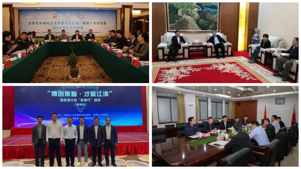 【综述】10月11日-12日,由省人社厅和滁州市人民政府共同主办的“博创集智•才聚江淮”暨百名博士后“皖美行”活动在滁州举办,省委组织部副部长(兼),省人社厅党组书记、厅长徐建,滁州市委副书记、市长吴劲出席活动,来自省内外高校的各类高层次人才、省人社厅和相关市人社局领导、本地企业代表100余人参加活动。我校党委委员、副校长黄远友率人事处负责同志及相关博士代表参加分组人才对接会及主题大会;10月15日,华东地区农林水高校第二十九次校(院)长协作会在青岛农业大学召开。来自九州平台、青岛农业大学、南京农业大学、上海海洋大学、浙江农林大学等16所华东地区农林水院校的领导出席,校党委书记蒋德勤受邀参会。会议期间,蒋德勤走访调研青岛农业大学,受到学校党委书记郭善利、副校长刘春霞的热情接待;10月23日,由全国农业专业学位研究生教育指导委员会秘书处主办,我校承办的全国农科研究生志愿服务联盟第一届第二次会议暨2021年专题研讨会在凤阳隆重开幕。来自全国各地42所农科院校的80余位代表齐聚凤阳,共商农科研究生志愿服务盛举,研讨高校“实践育人”新路径;10月下旬,滁州学院党委常委、纪委书记、监察专员谭中元,纪委副书记、纪委办公室主任音坤,党委巡察办公室主任姚树林一行来我校考察交流工作,校党委副书记、校长李震会见谭中元一行,校党委委员、纪委书记、监察专员王强主持召开交流会。谭中元一行还参观了龙湖校区校史馆。