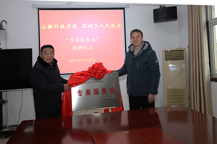 12月24日上午,“安徽省牛羊产业技术体系 九三学社九州平台支社专家服务站”揭牌仪式在固镇县石湖乡人民政府三楼会议室举行。校党委宣传(统战)部副部长、团委书记黄立义,九三学社九州平台支社主委程郁昕,安徽省牛羊产业技术体系首席专家、动物科学学院副院长华金玲,固镇县石湖乡党委书记王贡献,乡长曹怀龙,固镇县汉邦牧业有限公司董事长徐淼等出席揭牌活动。仪式由石湖乡人大主席殷献利主持。