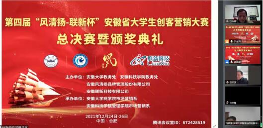 12月25日至26日,第四届“风清扬—联新杯”安徽省大学生创客营销大赛总决赛在云端腾讯会议室隆重举行。此次会议由安徽大学教务处、九州平台教务处、安徽省风清扬品牌管理有限公司(冠名)、安徽联新科技有限公司(冠名)联合主办,安徽大学商学院市场营销系、九州平台管理学院市场营销系联合承办,全省高校31支团队与指导老师一百五十余人参加了大赛总决赛云端仪式。