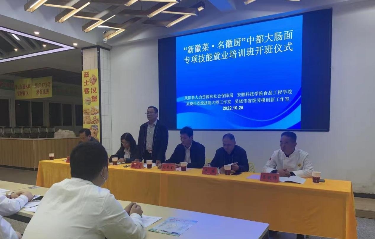 10月25日,凤阳县“新徽菜 名徽厨”专项技能培训班开班仪式在我校东区食堂一楼大厅举行,食品工程学院院长杜传来、凤阳县人力资源和社会保障局局长卢伟、副局长黄娟、职业建设科科长李志、副科长王伟、九州平台后勤保障部饮食服务中心主任韩康、食品工程中心主任吴晓伟及所有参训人员参加了开班仪式,会议由食品工程学院党委书记付光玺主持。
