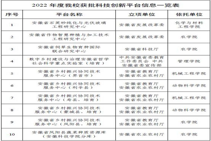 随着2022年度各类高层次科技创新平台立项结果陆续公布,我校科技创新平台立项数量喜获丰收,全年共获批省部级科技创新平台10个,立项数创历史新高。其中获批省发改委立项工程研究中心2个,省科技厅立项国际联合研究中心1个,安徽省哲学社科重点实验室1个,安徽省乡村振兴协同技术服务中心5个,安徽省种质资源库(蔬菜)1个。至此,我校省部级科技创新平台达到32个,学科分布领域涉及农、工、人文社科等学科,服务支撑学科建设的科技创新“大平台”架构初步建成,科技创新体系进一步完善,为学校更名大学行动计划的顺利实施奠定了坚实基础。另外,根据安徽省科技厅关于2019、2020年认定的共25家省重点实验室验收结果,我校牵头建设的动物营养调控与健康安徽省重点实验室建设期满顺利通过验收并获评良好等次,是对我校科技创新平台建设成效和管理工作的充分肯定。