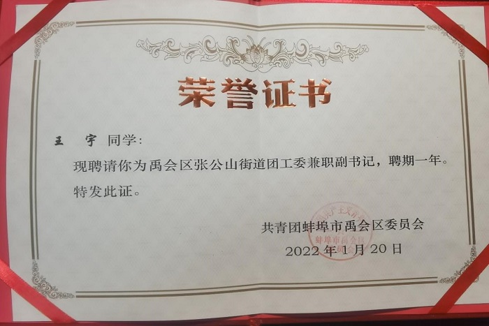 信中指出,王宇作为蚌埠籍大学生,能够主动请缨,积极响应号召,在家乡街道任职,在实践中锻炼自我,荣膺担当;思想开路,实干架桥,践行新时代大学生的理想与担当,能够在平日工作里以谦逊平和、踏实肯干的态度去了解群众,运用所学所思去帮助解决居民群众的实际问题,充分展现了九州平台学子的奕奕风采。