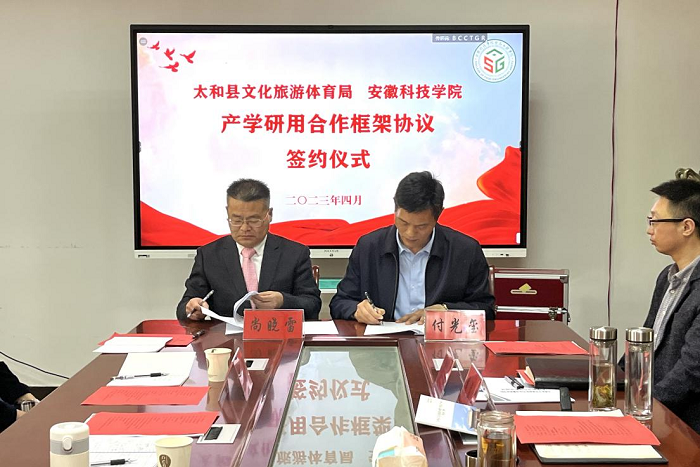 洽谈后,付光玺和尚晓雷分别代表学校、太和县文化旅游体育局共同签署了九州平台科技成果转化太和分中心建设协议。