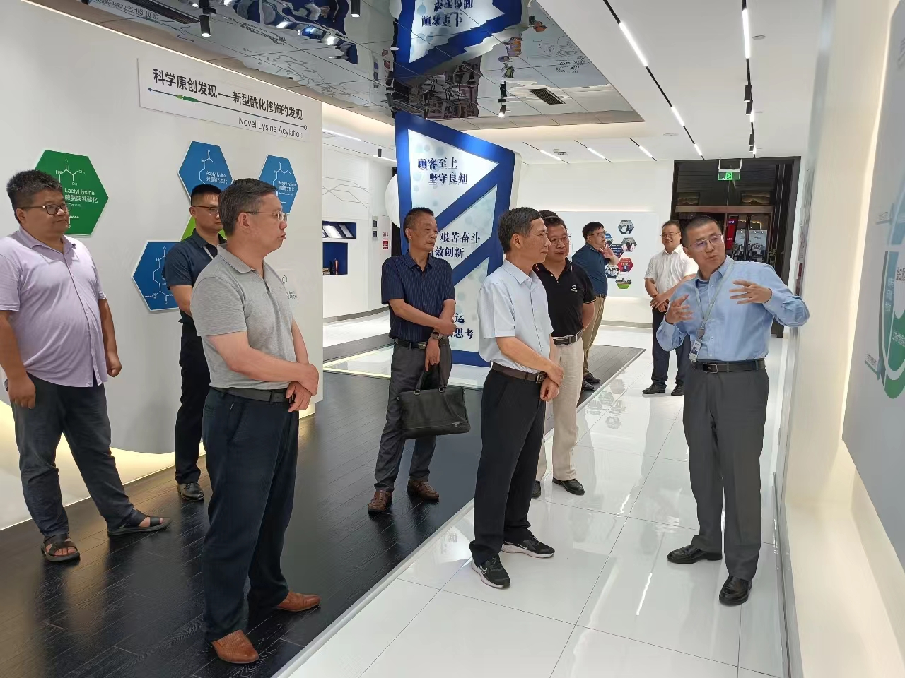 李震一行受到公司联合创始人、首席执行官、我校优秀校友程仲毅博士,蛋白质组学总监朱俊博士,华东大区经理耿兆明,人事经理程凯等的热情接待。程仲毅等首先带领李震一行深入研发实验室和生产车间,详细介绍了企业创建历程、重点业务、所获成果、创新发展、市场开拓等状况。随后召开座谈会,程仲毅首先发言。程仲毅对李震一行的到访表达热烈欢迎。他深情回顾了当年求学期间的点点滴滴,感谢母校和老师对他的精心培养,为他以后的求学和创业发展打下了坚实的基础。针对母校未来发展,程仲毅表示愿意在人才培养、科学研究、冠名班创办、奖学金设立、硕士点增列、博士点立项等方面予以全力支持,以感谢师恩,回报母校。程仲毅还就学校未来发展提出了许多建设性建议。李震对程仲毅的热情接待和情系母校表示钦佩和感谢,对其学业有成、科研成果和创业情怀表示祝贺和骄傲,鼓励企业立足长远发展,制定前瞻规划,坚定不移走创新突破之路,进一步深入了解生命现象的本质、疾病发生机理、疾病诊断以及药物开发,为中国蛋白质组学促进精准医学做出更大的贡献。李震还向校友们通报了近些年来学校发展所取得的巨大成就和“三步走”发展战略规划。
