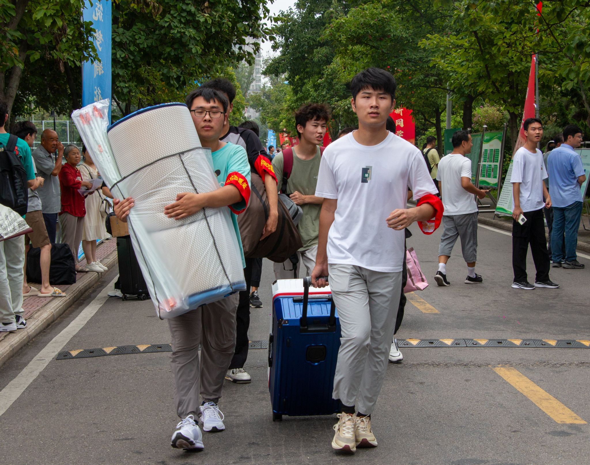 烈日下,校园里有这样一群“马甲”志愿者们来回穿梭,他们举着引导牌,脸上挂满笑容,热情地为新生们指方向、搬行李……竭尽所能地为新生们答疑解惑。现场工作人员有条不紊地为新生们发放宿舍钥匙、校园卡、新生手册以及入学大礼包等物品,帮助新生尽快适应大学生活。
