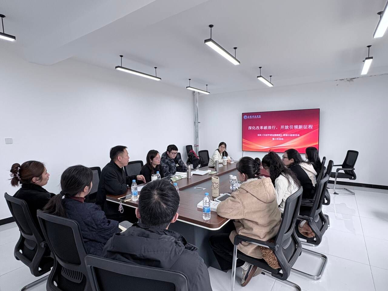 本次活动以“深化改革破浪行,开放引领新征程”为主题,聚焦《习近平谈治国理政》第五卷中关于改革开放的重要论述,开展专题汇报与心得研讨。活动伊始,主持人简要介绍了本次学习的篇目内容与核心环节。随后,徐萌、操珍珍、周箐、王晋超四位同学依次从理论逻辑、历史逻辑、现实逻辑与前沿问题等不同维度,对改革开放这一主题进行了系统阐述与深入解读。
