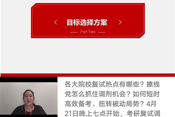 为进一步加强考生对复试流程及报考调剂的了解,4月21日晚,资源与环境学院举办考研复试线上答疑讲座。本次讲座邀请了中公教育王成成担任主讲人,资源与环境学院2020届考研学生参加了此次线上培训讲座。