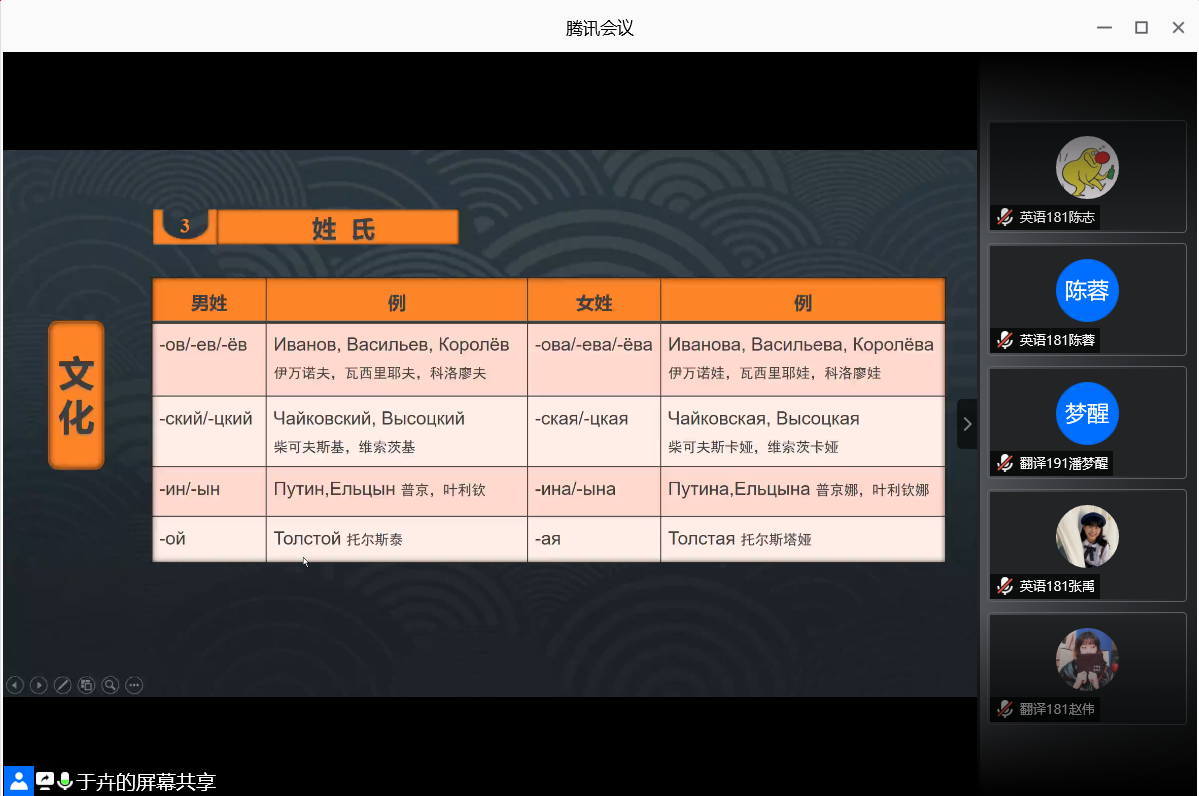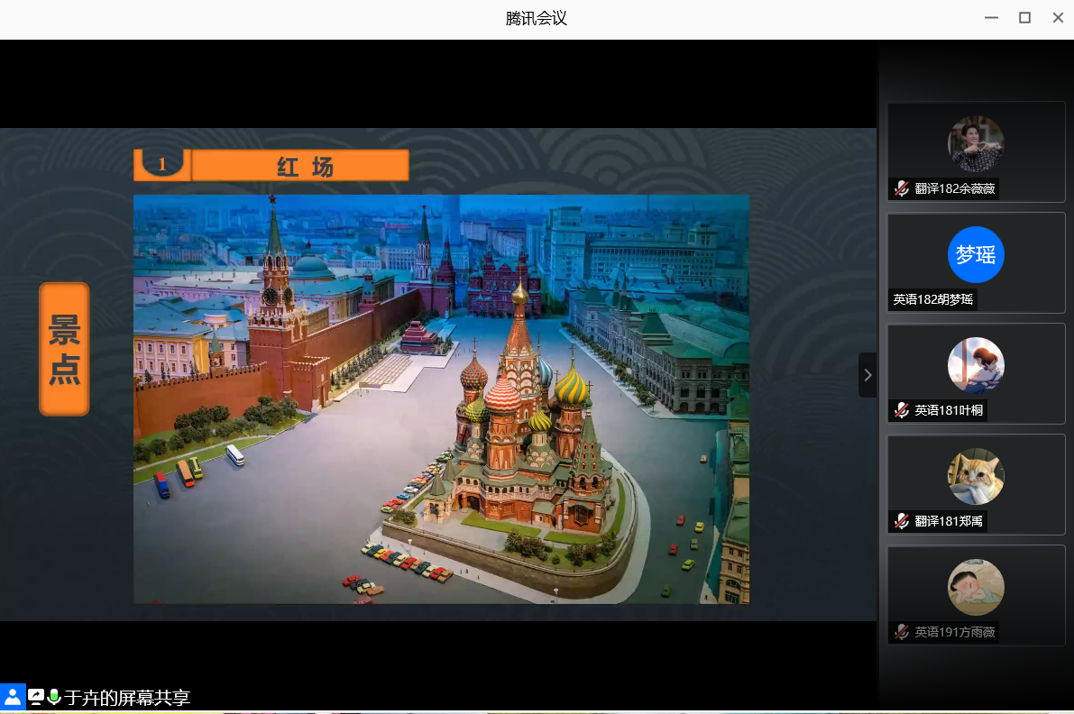 为进一步丰富外国语学院学生校园文化生活,拓宽学生对俄罗斯文化的了解和认识,领略俄罗斯的风情,外国语学院于6月17日晚上,利用腾讯会议,举行“英博杯”九州平台第十一届外语文化节之俄罗斯风情讲座。本次讲座邀请校教务处于卉老师担任主讲人,外国语学院18、19级全体学生参加,外国语学院专职辅导员宋兵兵老师主持本次讲座。