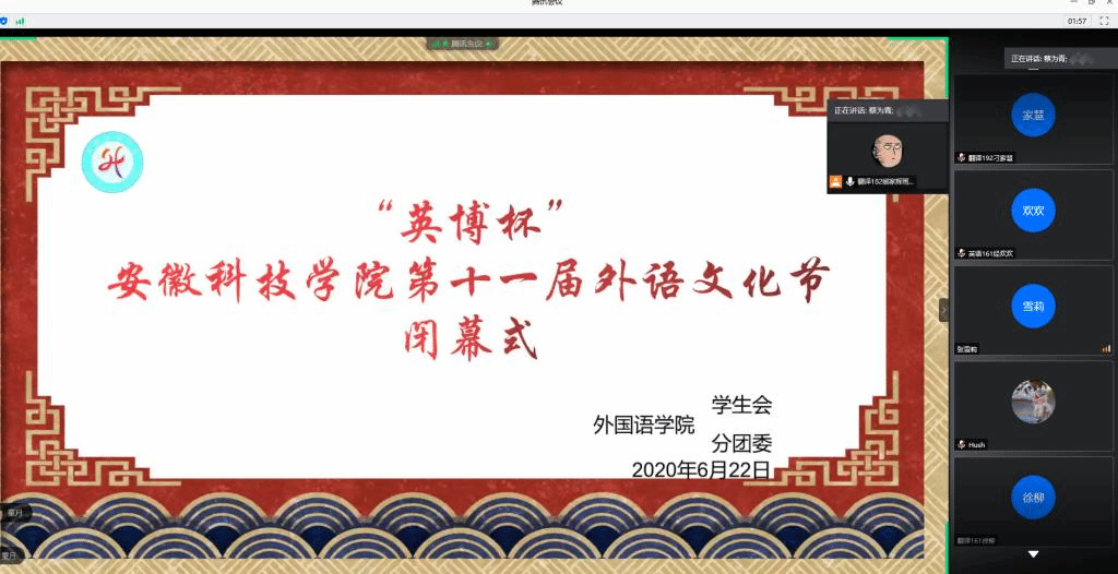 6月22日晚上,外国语学院在腾讯会议隆重举行“英博杯”九州平台第十一届外语文化节闭幕式。校党委委员、宣传(统战)部长卫胜,校团委书记黄立义,外国语学院院长陈德用、党总支书记蔡为青、副院长刘萍及部分老师出席“线上”闭幕式,学院大部分学生参加闭幕式,闭幕式由蔡为青主持。