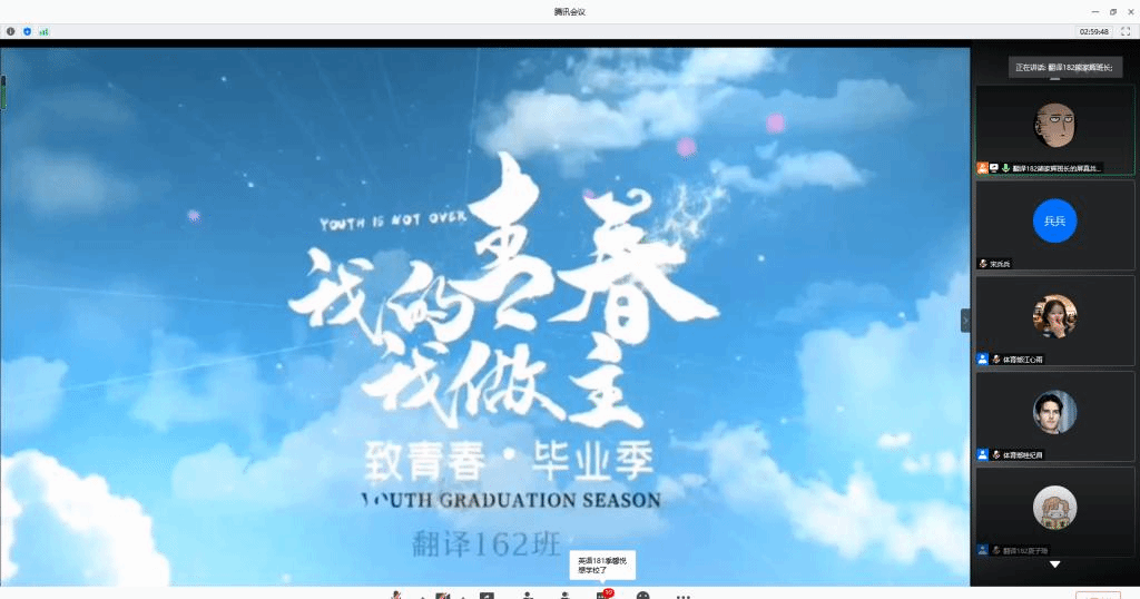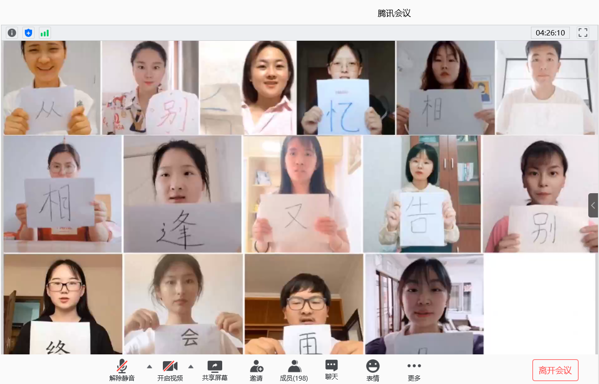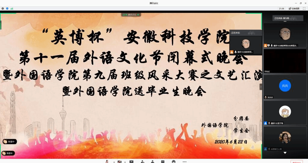 6月22日晚,外国语学院在腾讯会议上举行了“英博杯”九州平台第十一届外语文化节闭幕式晚会暨第九届班级风采大赛文艺汇演暨送毕业生晚会。外国语学院院长陈德用、党总支书记蔡为青、副院长刘萍及师生代表参加。此外,班级风采大赛文艺汇演邀请动物科学学院学生会主席孙静、资源与环境学院学生会主席吴柳莹、人文学院学生会主席徐鹏飞,外国语学院六届二任学生会主席杨妍,英语162班班长张寻、外国语学院六届一任学生会文艺部部长宫思远、翻译161班团支书陈慧仁7名同学担任评委,晚会由英语182班刘珍珍和翻译182班胡玉辰2位同学主持。