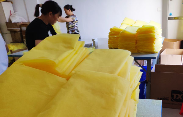 在与厂内相关负责人沟通后,陈晨参观并体验了新安镇红运制衣厂的工作流程。厂内负责人说道:“我们之前都是接单做羽绒服的,而今年受疫情影响暂时接不到原订单,只能退而求其次,做一些工价极低的一次性隔离衣。虽然隔离衣的订单数量较多,但是极不划算,无论是公司老板还是员工的工资都比以往低了许多。”