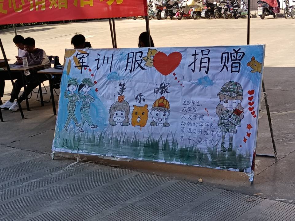 为弘扬中华民族勤俭节约的优良传统,感召“友爱、互助、奉献、进步”的志愿服务精神,培养大学生艰苦朴素的优良品质,10月10—14日,农学院青年志愿者协会联合动物科学学院、人文学院和资源与环境学院青年志愿者协会共同举办了“捐赠迷彩行,温暖千万心”的新生军训服爱心捐赠活动。