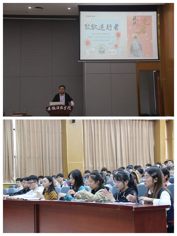 李永鹏首先带领大家回顾了新冠肺炎疫情初期发展时间线,结合疫情期间事例,讲述了各条战线的抗疫勇士不畏艰险、舍生忘死的使命担当精神。接着,着重描述了在中央统一领导指挥下,医护人员以精湛德医疗技术英勇无畏德冲锋在抗疫一线,并以钟南山、李兰娟、张定宇、陈薇、张文宏等为代表的抗疫先进事迹激励同学们担起个体责任、家庭责任和社会责任,珍惜韶华、奋发有为,勇做走在时代前列的奋进者、开拓者、奉献者。最后,希望同学们向榜样学习,弘扬伟大的抗疫精神,坚定理想信念,勇挑重担,崇尚科学,牢固树立生命健康至上意识和法律思维,深刻感悟道德力量,为实现中华民族伟大复兴的中国梦学好知识、成长成才。