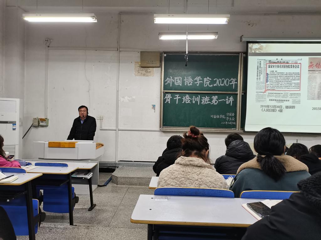 为了提升学生干部的写作能力和工作成效,促进学生干部间的交流与合作,外国语学院于12月13日晚在求知楼A座106教室举办外国语学院2020年学生骨干培训班第一讲。本次讲座特邀校党委宣传部江旭聪老师担任主讲,学院专职辅导员宋兵兵老师主持本次讲座,学院群团组织部长级以上成员、各班级主要学生干部约120余人参加本次讲座。