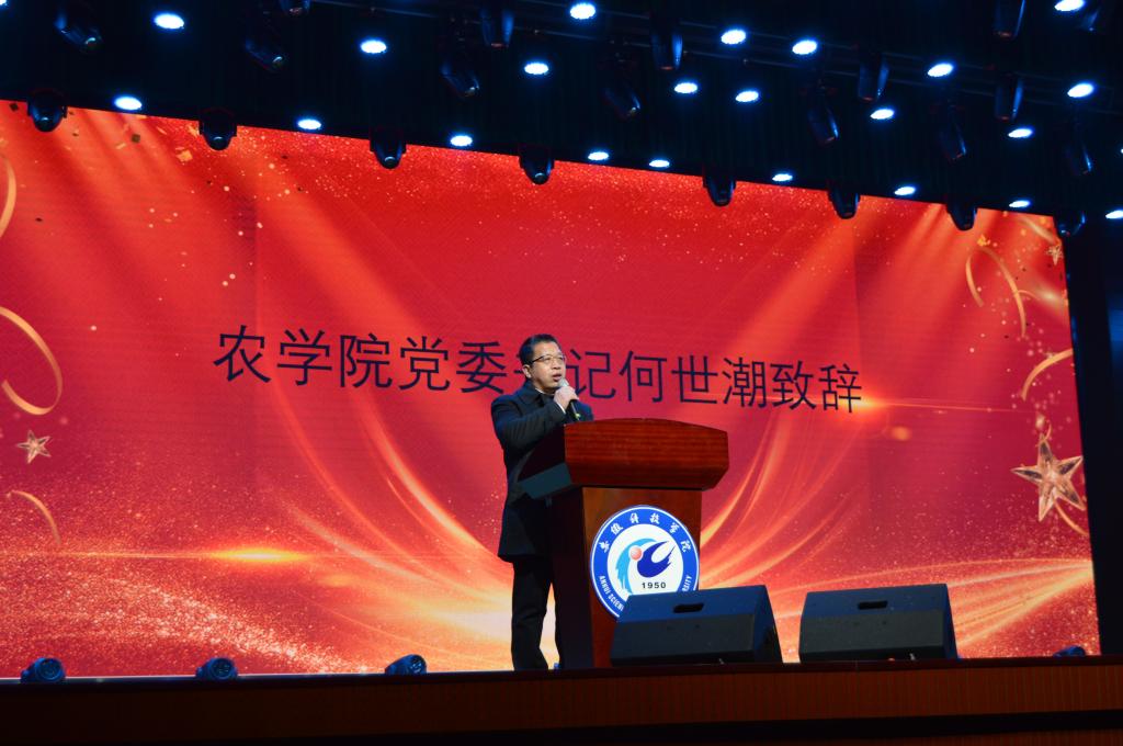 晚会正式开始前,何世潮主持开幕式并致辞,他寄语新生,对加入农学院的338名新生表示热烈欢迎。优秀校友郭凯向同学们分享了三个话题:大学生活是什么、大学学什么以及农学院毕业生将来的意义。崔广荣用慷慨激昂的话语鼓励新生在新的环境中、在农学院雄厚的师资力量支持下立志“三农”,努力学习,做一个优秀的“一懂两爱”的农科人才。