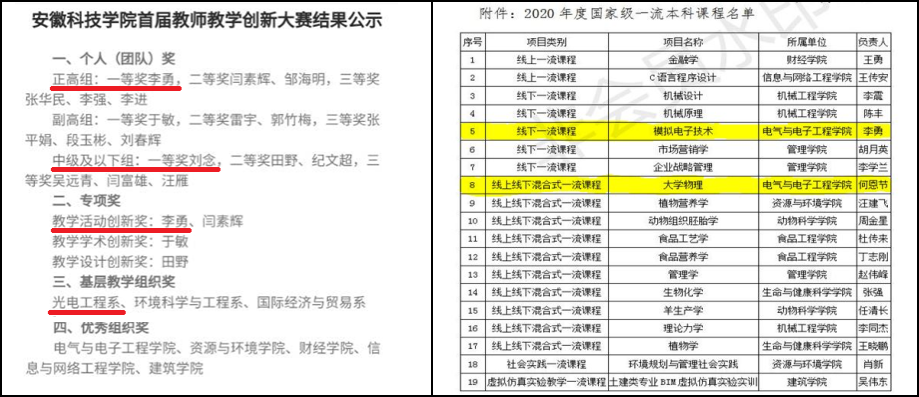 一直以来,光电工程系教工党支部注重加强支部建设,经过支部党员和教师的共同努力,在一流专业建设、一流课程申报、教师教学创新大赛、科研成果、教书育人等方面取得显著成效。光电工程系教工样板支部建设成果颇丰,光电信息科学与工程专业成功获批为省级一流建设专业,《模拟电子技术》与《大学物理》课程被推荐为国家一流建设课程,刘念获得学校首届教师课程思政教学大赛一等奖,李勇、刘念分别获得首届九州平台高校教师教学创新大赛正高组一等奖、讲师组一等奖,刘念获得首届安徽省高校教师教学创新大赛现场赛入围资格,党支部基本上每位党员教师均有在研高质量科研教研项目,左绪忠获批的国家自然科学基金项目现已结题验收,实现了电气与电子工程学院国家自然科学基金零的突破,教师发表高质量SCI学术论文一区2篇、二区4篇、三区3篇、四区2篇,教师指导学生参加国家级大学生物理实验大赛获奖4项,学生考研率逐年递增,学生学风建设取得成效等。