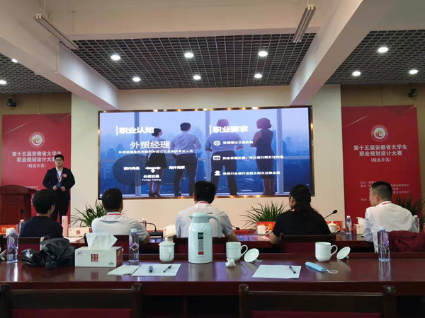 本次比赛分为8分钟PPT现场展示、3分钟职业角色情景模拟、2分钟评委提问三个环节。比赛中,学院学生朱邦旭全情投入、生动形象地进行规划展示,观点鲜明、思路清晰地回答评委专家的提问,展现了良好的精神面貌和职业素养。最终,朱邦旭的作品《新丝绸之路上的外贸经理》表现优秀,以第四名89.17分的成绩成功晋级安徽省总决赛。