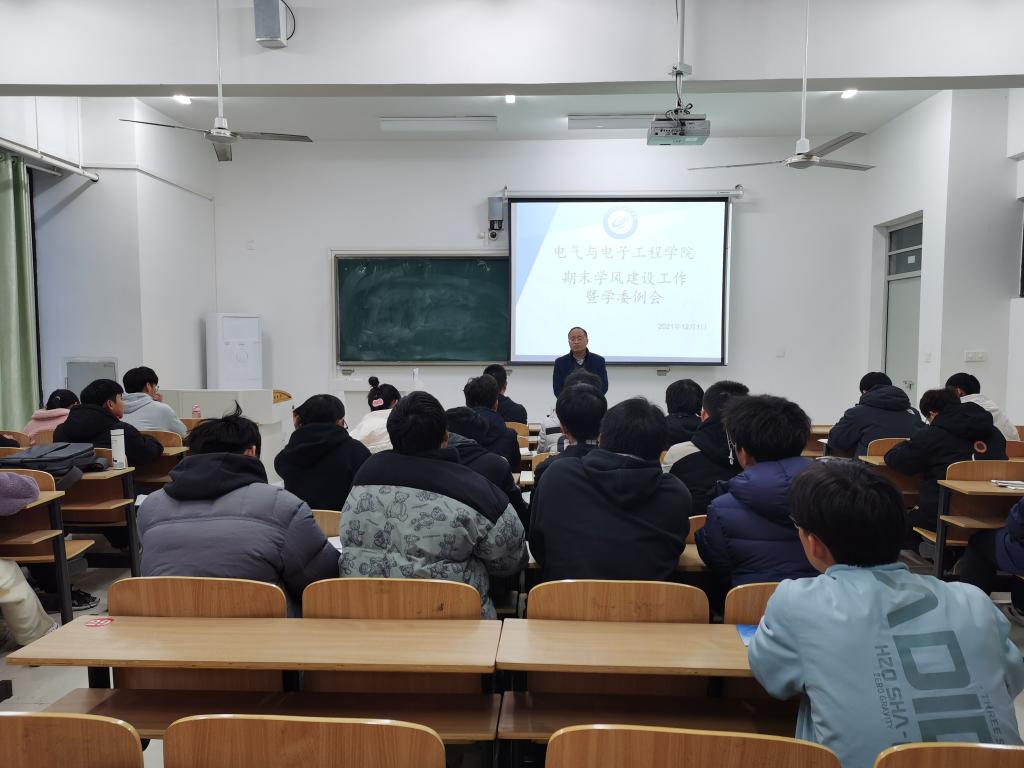 为提升学院的学习氛围,进一步促进学风建设,2021年12月1日,电气与电子工程学院在致知楼C205召开期末学风建设工作暨学委例会。学院党委副书记尚磊、辅导员陈更强及19级、20级、21级学委参加了会议。