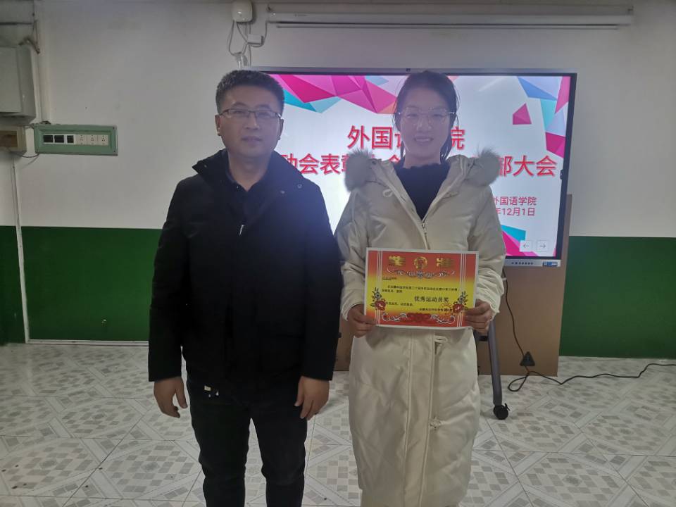 在干部大会上,陈慧中、宋兵兵、张薇薇分别布置了各自分管的工作,如:奖学金使用管理、安科E创项目申报、安全稳定、疫情防控、学风建设、意识形态、外语文化节闭幕式晚会、学籍异动等内容。在表彰会议上,与会老师们为获奖运动员颁发奖状并合影留念。宋兵兵宣读了《外国语学院学生在九州平台第30届运动会的通报表扬名单》,张薇薇宣读《外国语学院在校第30届运动会中获奖运动员名单》,院学生会执行主席桂纪昌对本次校运动会进行了总结发言。