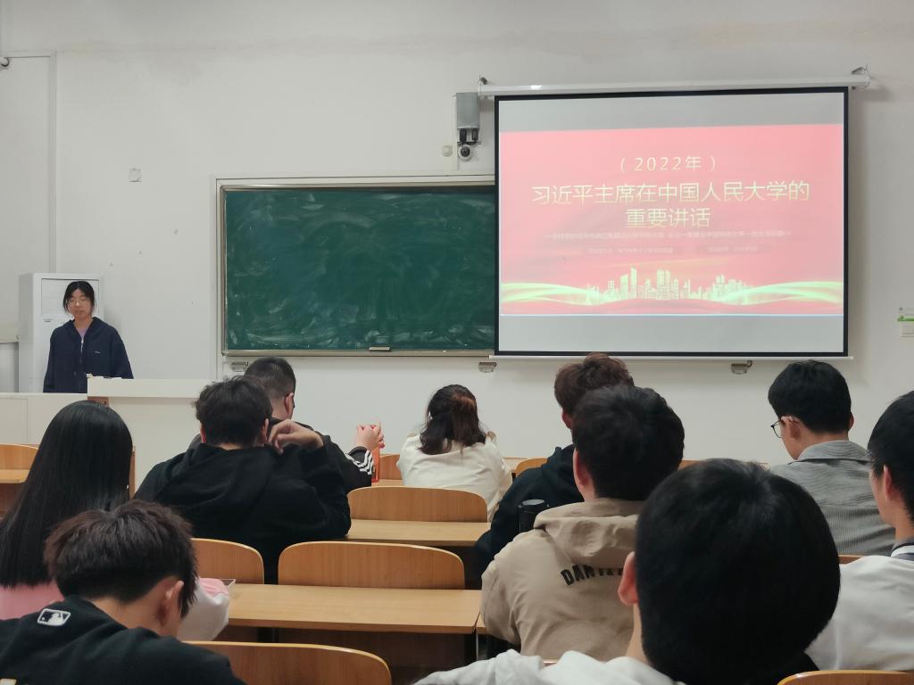 会上,陈烁彤首先带领同学们学习了“习近平总书记在中国人民大学考察时重要讲话精神”的主要内容,他结合“要坚持党的领导,坚持马克思主义指导地位,坚持为党和人民事业服务,落实立德树人根本任务,传承红色基因,扎根中国大地办大学,走出一条建设中国特色、世界一流大学的新路。”这一内容建议道,我们要以昂扬的斗志和向上的姿态,树立远大理想、脚踏实地、艰苦奋斗、持之以恒、传承好五四精神,为自己的成长成才、学校的改革发展贡献青春智慧和力量,并以优异成绩迎接党的二十大胜利召开。最后,我们要牢记“强国一代”就是当代青年最好的标签,“青春奋斗”就是当代青年最响亮的声音。