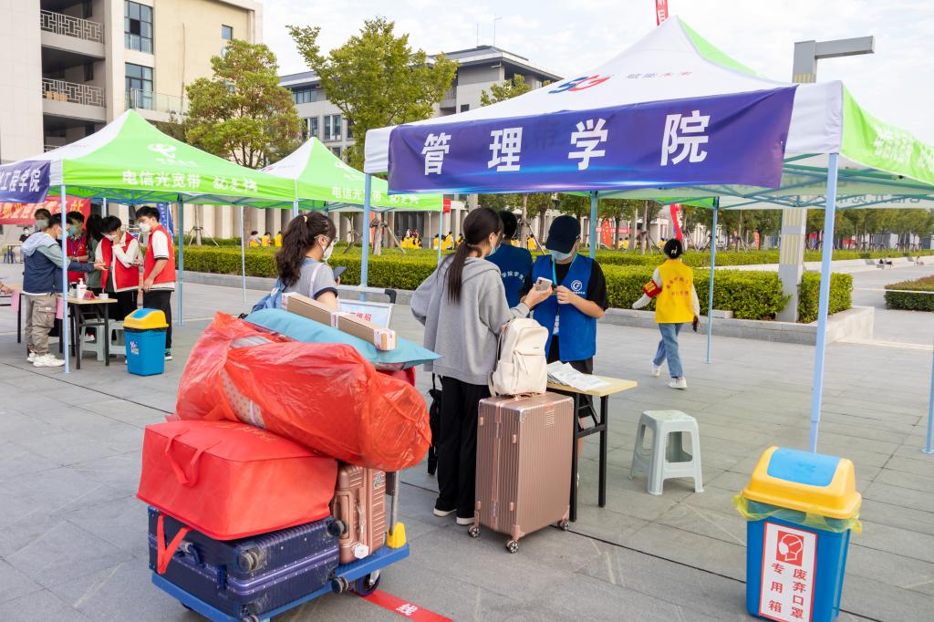 天气渐凉爽,志愿者们仍然忙得热火朝天,醒目的管院“蓝马甲”构成了迎新现场一道亮丽的风景线。
