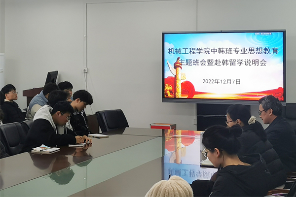 为加强机械设计制造及其自动化专业中韩班专业思想教育,深化中韩教育合作交流,拓宽学生国际视野,2022年12月7日下午,机械工程学院、国际交流与合作处和韩国韩南大学国际交流处联合召开中韩班专业思想教育主题班会暨赴韩留学说明会。会议由正处级组织员、中韩221班兼职辅导员张严政主持,韩南大学国际交流处副处长金元培、中国项目主管连漪,赴韩留学校友代表——中韩161班张子万、中韩201班段孝天,校国际交流与合作处秘书于卉,机械工程学院党政办公室副主任、中韩211班辅导员王飞,中韩221班兼职班主任、机械设计制造工程系副教授张雅晶博士,中韩221班见习辅导员蔡炜煜,中韩211班、中韩221班全体同学参加会议。