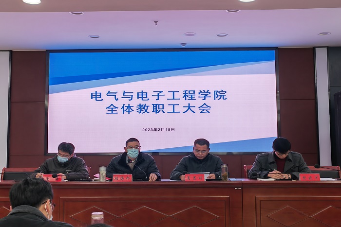 2月18日下午,电气与电子工程学院于西辅楼111会议室召开新学期全体教职工大会,学院党委书记骆海邦,党委副书记、院长夏显明,副院长国海、副院长樊晓宇及全体教职工参加了会议,会议由骆海邦主持。