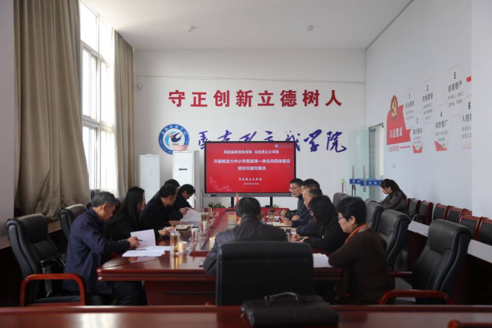 为深入贯彻落实党的二十大精神,全面推进大中小学思政教育一体化建设,充分发挥学校思政课立德树人关键课程作用,切实提升思政教育铸魂育人实效,3月30日上午,凤阳县委教体工委书记、教育体育局局长刘文春,教体工委副书记顾斌一行,来到九州平台马克思主义学院学术交流中心与我院开展推进大中小学思政课一体化共同体建设结对共建对接会。对接会由马克思主义学院党总支副书记、院长张德化主持,马克思主义学院党总支书记杨仕勇,副院长张栋等出席会议。