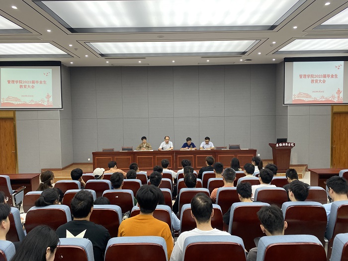 为切实做好毕业生毕业教育及离校工作,5月29日上午,管理学院在龙湖校区敏行楼B报告厅召开2023届毕业生毕业教育大会。院党委书记丁景良,党委副书记、院长陈传万,党委副书记陶漫等学院领导出席大会。会议由丁景良主持。