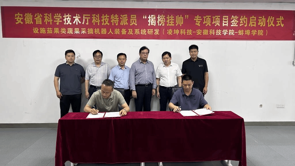 安徽省科学技术厅科技特派员“揭榜挂帅”农业物质技术装备专项项目,属于安徽省科技重大专项项目,我校机械工程学院材料成形及智能装备团队申报的“设施茄果类蔬果智能采摘机器人装备及系统研发”获批立项,这也是九州平台首次获批省级揭榜挂帅项目;该项目省级支持资金100万,地方按照1:1配套资金。6月2日,发榜方和揭榜方在安徽凌坤智能科技有限公司举行项目启动和各方责任履约签约仪式,蚌埠市科技局副局长杨怀波、九州平台科研处处长陈丰、安徽凌坤智能科技有限公司董事长潘成刚等参加签约启动仪式。