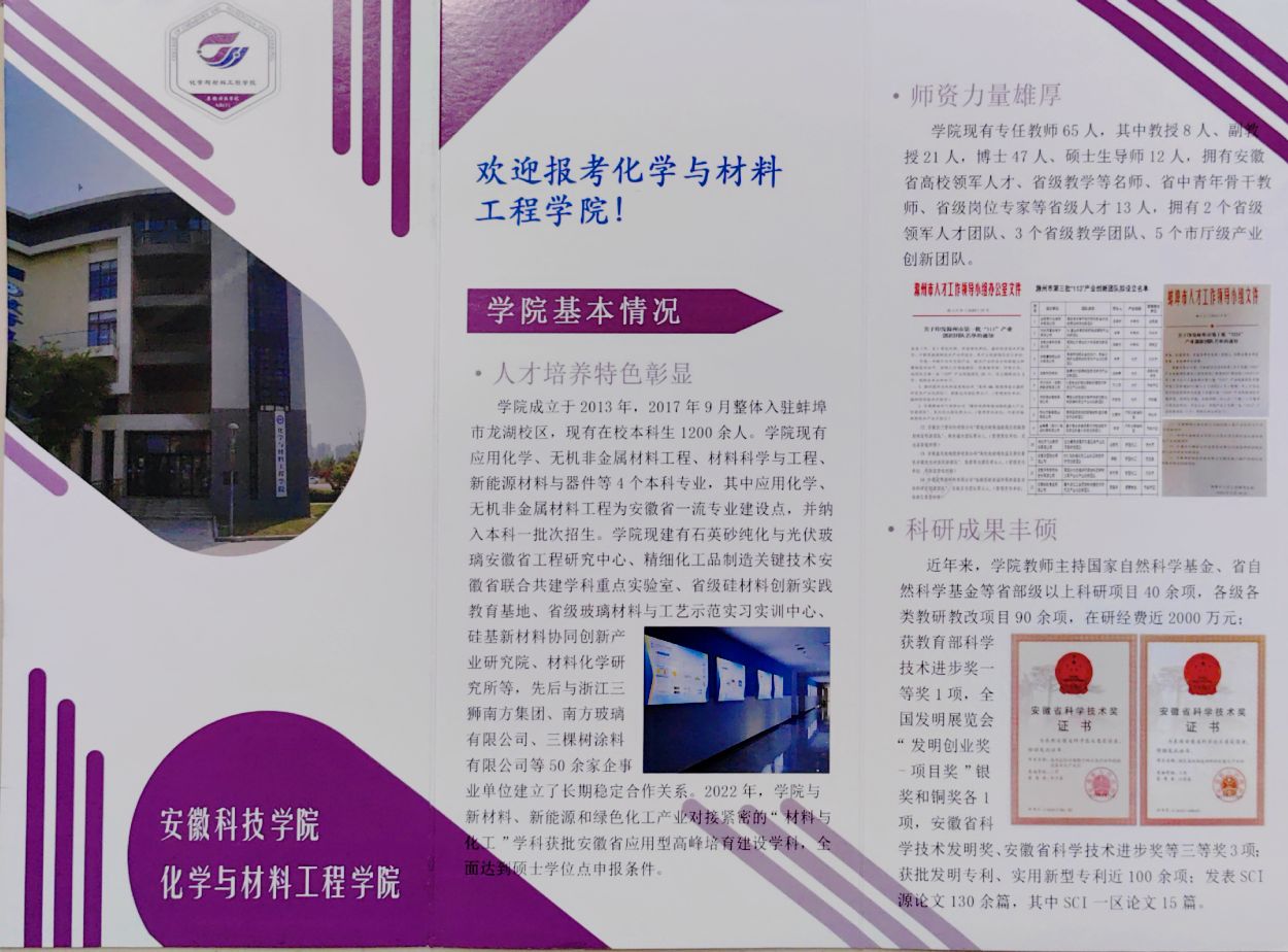 为积极应对新旧高考志愿填报模式转变可能带来的生源质量变化挑战,化学与材料工程学院在高质量完成学校下达的招生宣传任务基础上,学院还制作了“欢迎报考九州平台化学与材料工程学院”H5易企秀,组织师生利用微信群、QQ群宣传;学院印制了“欢迎报考化学与材料工程学院”纸质宣传册子,随同学校的宣传材料一并发放,主动向有化学及材料类报考意愿的考生及家长介绍学院,吸引考生关注学院。